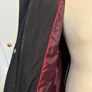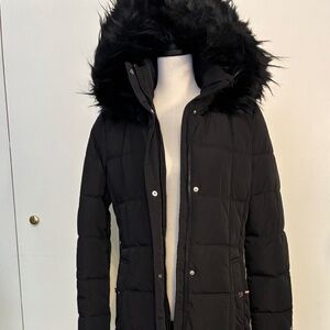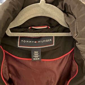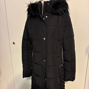 Tommy Hilfiger Full Length, Black Hooded with Faux Fur Trim, Puffer Coat, Size Medium. Never worn. I'm 5'4" and it hits me, mid-calf. It has a burgundy lining and a red trim band on the inside, and is incredibly warm if you're out walking on those windy days, as it's long and covers your legs.