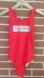 Stylish red one-piece swimsuit featuring a shiny foil logo in front and circle cutout at back. . Perfect for beach days.