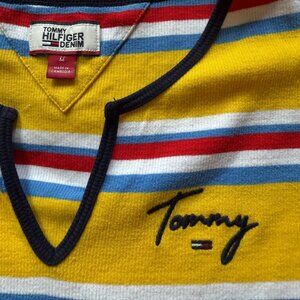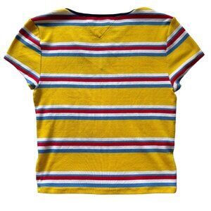 Yellow Tommy Hilfiger t-shirt with horizontal stripes in red, white, and blue. It features a v-neckline with a black trim and short sleeves. Very soft, ribbed material.
