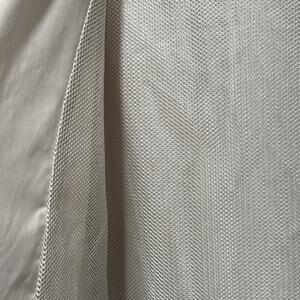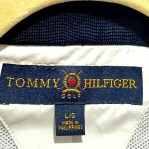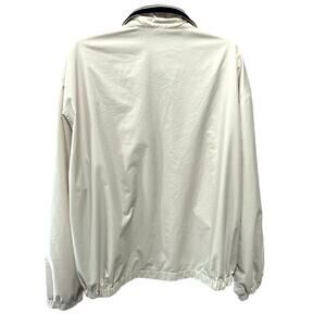 Excellent, preowned condition lightweight polyester, golf style, zip front jacket by Tommy Hilfiger is ecru colored. Elasticized wrist at long sleeves. And elasticized at hips. Two sides, zipper pockets. Mesh lining. Lightweight polyester. Black knit collar has two light colored stripes. Measurements are taken flat and are approximate.