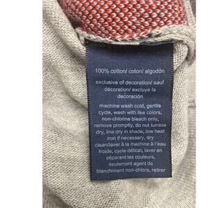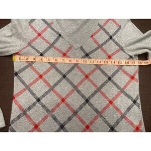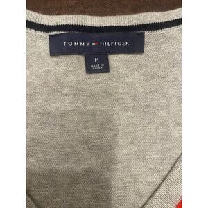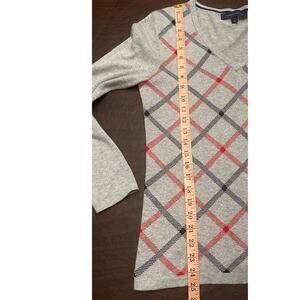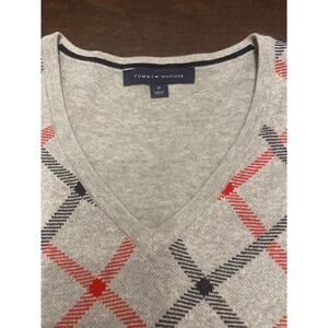 Classic Tommy Hilfiger argyle sweater in soft gray with red and navy diamond pattern. Features a flattering V-neckline and long sleeves with a small Tommy flag logo on the cuff. Lightweight knit ideal for layering in cool weather.