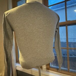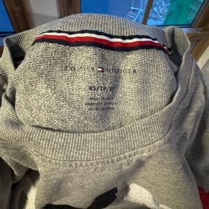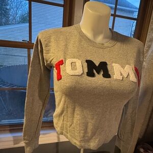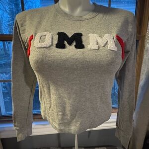 Classic gray sweatshirt by Tommy Hilfiger. Features bold red, white, and black accents.