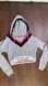 Stylish gray V-neck sweater with bold red and blue accents. Features a comfortable hoodie and Tommy Hilfiger branding on the hem. Ideal for casual outings.