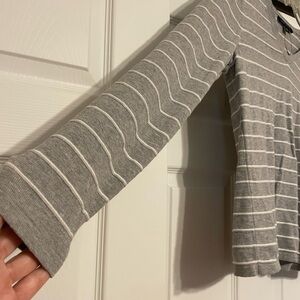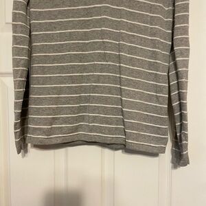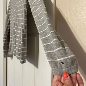 Tommy Hilfiger gray and white striped shirt in size small. • Long sleeves • V-neckline • Knit Jersey • 100% Cotton