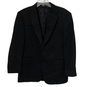 Charcoal, dark, black, grey, 72% wool, 20% silk, 8% cashmere blazer, jacket by Tommy Hilfiger in a men's size 40S. Two front buttons. Fully lined. Front pockets. Fabric feels like a felted wool to the touch and has some weight to it. Dry clean. Approximate measurements shown in photos.