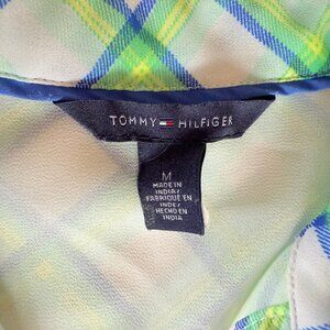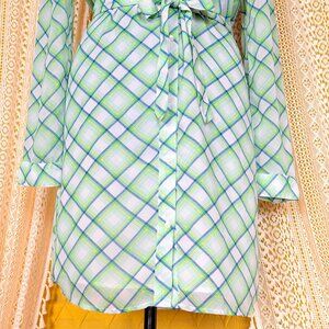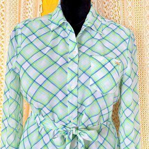 Tommy Hilfiger Green & Blue Plaid Sheer Belted Midi Shirt Dress Size M