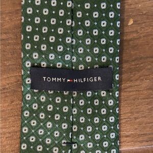 This Tommy Hilfiger tie features a sophisticated green hue with a subtle polka dot pattern, crafted from a luxurious silk fabric. Its classic design and standard width make it a versatile accessory for any formal occasion.