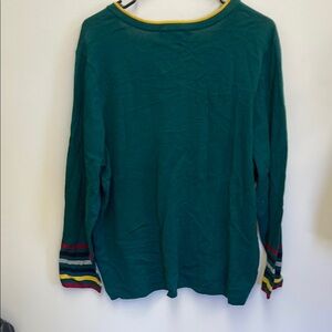 Stylish green V-neck sweater by Tommy Hilfiger. Features colorful striped cuffs.