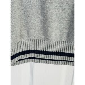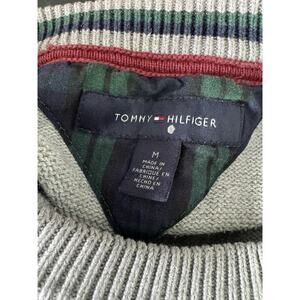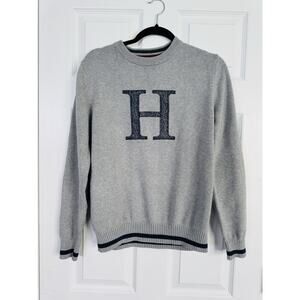 Classic Tommy Hilfiger crewneck sweater, large logo H and navy blue on the front hundred percent cotton gray sweater size medium