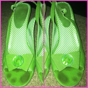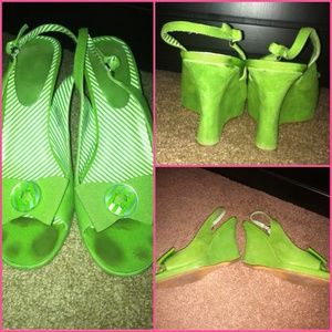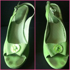This shoe is the most beautiful color of green I've ever seen! Tommy Hilfiger calls it Kelly Green look at the pictures. They are size 9.5 and from the Hampton collection. The wedge is 4 inches and sadly too high for me. The only flaw is the toe marks which are not visible when on and I'm sure could be cleaned almost perfectly. You can't find these anywhere!