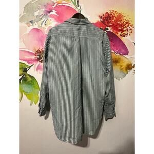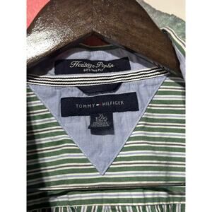 Elevate your casual style with this Tommy Hilfiger Heritage Poplin shirt. The 80s inspired striped pattern in blue, green, and white adds a touch of nostalgia to any outfit. The button-down collar and button-front closure give a classic look, while the long sleeves make it perfect for any season.