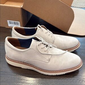 Some light wear on bottom from try ons but original box is missing and there is one small scuff. These Tommy Hilfiger Oxfords feature a sophisticated gray suede upper, offering a blend of classic style and modern elegance. The shoes boast a traditional lace-up closure and a low-profile silhouette, making them perfect for both formal and casual occasions. With their minimalist design and versatile color, they are an ideal addition to any wardrobe.