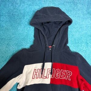Tommy Hilfiger Hoodie Womens M Blue Hooded Sweatshirt Spellout Flag Logo