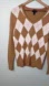 Chic V-neck sweater with a classic argyle design. Features tan and white with pink accents. Perfect for layering. EUC