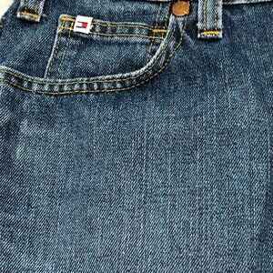 This Tommy Hilfiger Jean Pencil Skirt in a distressed medium wash is a stylish choice for any wardrobe. With a side slit and the iconic brand logo, it's designed to flatter in size 6.