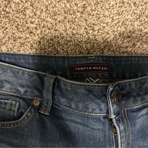 These Tommy Hilfiger jean shorts feature a medium blue wash with a subtle fading effect, offering a classic denim look.