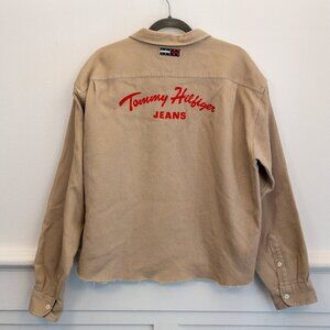 Bring a touch of vintage Tommy flair to your wardrobe with this cropped utility shirt jacket. Made from textured beige cotton with a relaxed, boxy fit, it features a raw frayed hem for a lived-in, streetwear edge. The bold embroidered Tommy Hilfiger JEANS logo across the back adds signature retro style, making it perfect for casual layering or Y2K-inspired outfits.