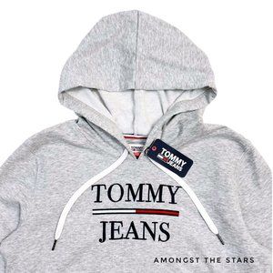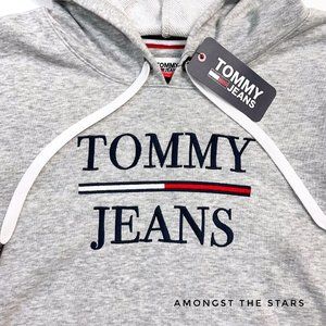 Brand new with tags, Women's size Small & Medium. Retails for $69! This Tommy Hilfiger Jeans Logo Embroidered Heather Grey Drawstring Hoodie is a must have for any closet! This black drawstring hoodie has Tommy Jeans embroidered in navy blue. Red, white and blue flag box logo is embroidered on the chest as well. Very soft and comfortable!