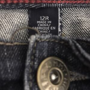 The product is a pair of Tommy Hilfiger women's jeans in a size 12 with a regular fit. These bootcut jeans feature a high rise, dark wash denim with a stretch fabric for comfort and flexibility. They have a classic five-pocket design, zip closure, and button accents. The jeans are machine washable and made from a cotton blend material, with a leg opening of 9.5 inches. Perfect for all seasons, these American-made jeans are a stylish and versatile addition to any wardrobe.