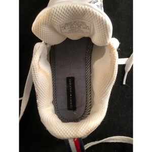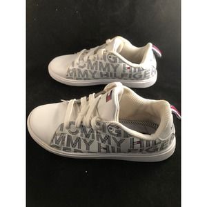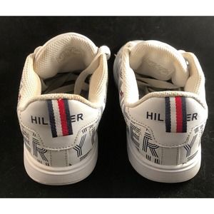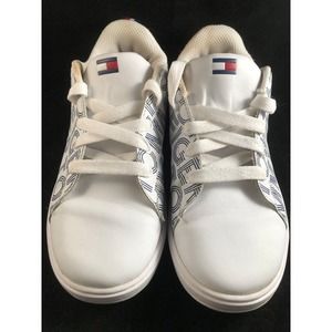Tommy Hilfiger Kids Iconic Court Logo Shoes. They are a kids size 4. There is some staining on the edges where the foot goes in and the shoe laces are stained on the ends. You can see it in the pictures. It is in good used condition.