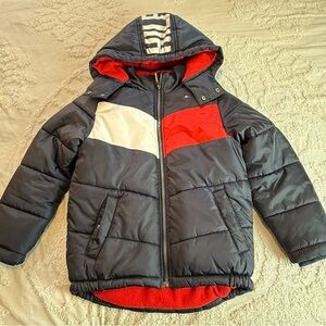 Keep your child warm and stylish with this navy and red hooded jacket. Perfect for chilly days.