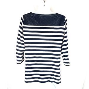 Tommy Hilfiger L Knit Top Faux Leather Yokes Navy Blue White Stripes 3/4 Sleeve