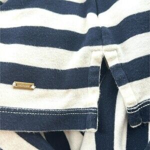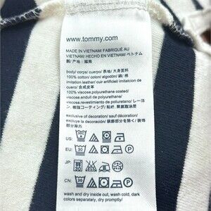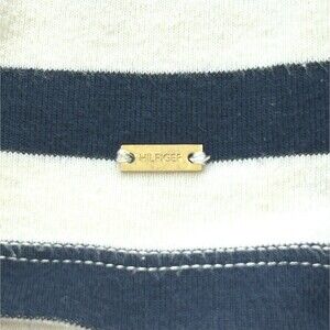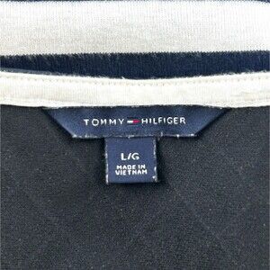 This Tommy Hilfiger knit top features navy blue and white stripes with faux leather quilt stitched yokes. It is a stylish and versatile design for the modern woman. With a classic round neck, 3/4 sleeves and pullover closure, this top is perfect for travel, casual outings, or workwear. Accented with contrast trim and the iconic Tommy Hilfiger logo, this top is a timeless piece that can be worn in all seasons. Women;s size Large. There is a little bit of piling. Gently preowned.