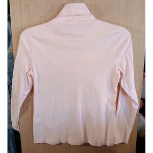 A Tommy Hilfiger pink turtleneck blouse for women in size L. This top features long sleeves with a classic fit, a pullover closure, and the Hilfiger logo accent. Made of 100% cotton knit fabric, it is suitable for casual or business occasions in fall and winter. The garment is machine washable and has a stretchy material for a comfortable regular fit.