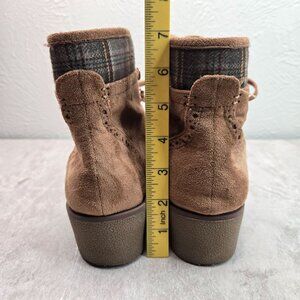 FEATURES/ACCENTS: Ankle style. Low flat heel. Wingtip and brogue accents. Round toe. Brown color with plaid pattern collar. Lace up closure.