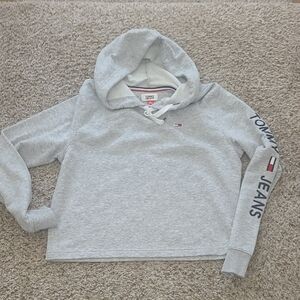 Light gray hoodie with Tommy Hilfiger logo. Features a lace-up neckline and logo on the sleeve.