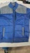 Stylish blue puffer jacket featuring gray accents. Perfect for a casual look.