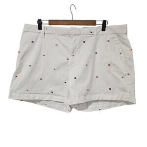 Tommy Hilfiger Girls' Logo Shorts in White. Size 18. Features zip fly, belt loops, side slant pockets, back welt pockets, and TH logo throughout. Style J0SWH238. 97% Cotton, 3% Elastane. Excellent pre-owned condition, no flaws.