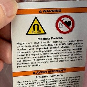 Of Note: This material wrinkles easily. I would not recommend this for an adaptive needs person who does not dry clean or have a laundry service, as ironing is difficult. ** Please take note of warning labels (photos included) as closure is magnetic and can disrupt functioning of medical devices.