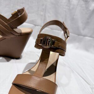 Tommy Hilfiger wedge sandals, Mare platform heels, Tan wedges size 9.5, Women’s summer wedge sandals, Hilfiger logo buckle heels, Brown platform shoes, Comfortable designer wedges
