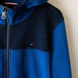 tommy hilfiger hoodie jacket men, tommy fleece jacket medium, men’s zip up hooded jacket, blue black colorblock fleece, hilfiger outerwear men, fall winter fleece hoodie