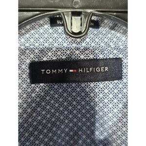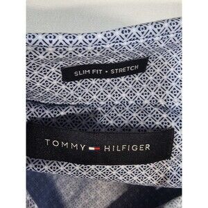 This is a Tommy Hilfiger men's blue button front shirt in size L. It features a slim fit, long sleeves, a collared neckline with button-down style, and a blue floral pattern. Made of cotton with stretch for comfort, this shirt is suitable for casual, workwear, or business occasions. It is machine washable and part of the Tommy Hilfiger product line.