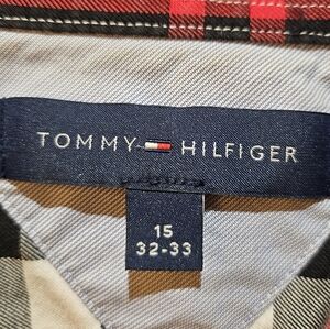 Stylish men's Tommy Hilfiger plaid shirt featuring a classic black and red design. Perfect for casual outings or a smart-casual look.