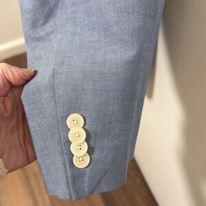 Tommy Hilfiger men’s blue sport jacket with white buttons. Features notch lapel, 2 button closure, 4 nonfunctional sleeve buttons, 2 front flap pockets, welt pocket at chest, 3 internal pockets, double bent and full lining.