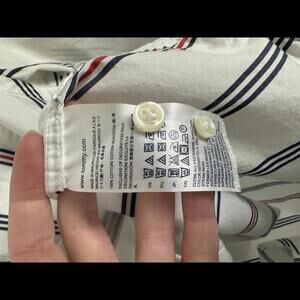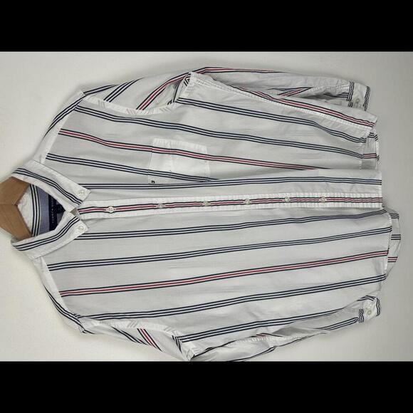Always preppy and USA, Tommy Hilfiger delivers this button down in a slightly oversized fit. White background with thin red and blue stripes throughout. Neck and pits are clean and fresh white. 100% cotton. Long sleeved. Collared. Single chest pocket with embroidered Tommy flag logo. Overall excellent condition.
