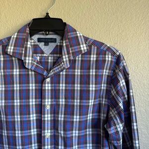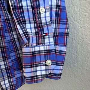 Tommy Hilfiger blue and red plaid long sleeve button-down dress shirt. Neck size 15 1/2, corresponds to a size medium. 100% cotton.