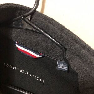 The Tommy Hilfiger full-zip fleece jacket features a color-block design with a black upper chest and collar contrasting against a dark gray body and sleeves. It includes a full zipper closure, two side pockets, and the subtle Tommy Hilfiger logo on the upper left chest. The jacket is made from soft, warm fleece material, making it ideal for layering and casual wear.
