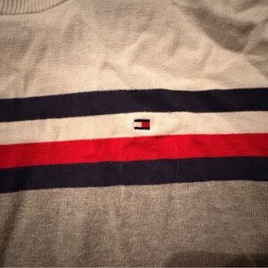 Classic crewneck sweater by Tommy Hilfiger. Features a gray base with striking red and blue stripes. Perfect for casual wear.