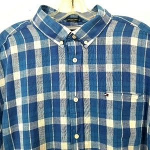 Tommy Hilfiger Men's Blue Custom Fit Cotton/Linen Short Sleeve Button Down Shirt