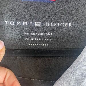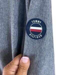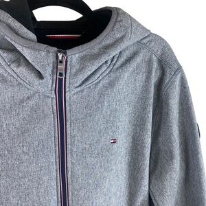 This gorgeous full zip hooded jacket is by Tommy Hilfiger. This gray jacket has long sleeves, with elastic cuffs. Jacket has two large zip closure front pockets. Jacket is breathable and water resistant. The jacket has an attached hood. There is a rubberized Tommy Hilfiger medallion on left sleeve.