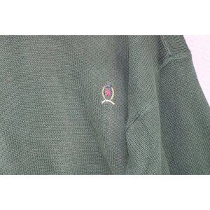 Tommy Hilfiger Men's Green Sweater-Size XL-Logo-Y2K. The material is 100% Cotton. Laying flat measuring armpit to armpit it is 27'' and 28'' in length.