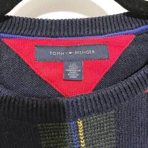 Tommy Hilfiger Men's Large Navy Blue Green Red Plaid Sweater W/Logo Crew Neck