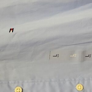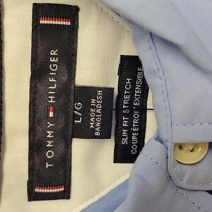 Classic blue Tommy Hilfiger slim fit stretch button-down shirt for a sharp, professional look. Perfect for any occasion. men's sz large. 98% cotton, 2% elastane. New with tags. 42" chest