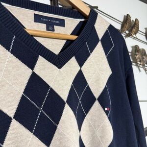tommy hilfiger mens argyle sweater size large navy beige cotton v neck preppy style golf office casual fall winter layering timeless