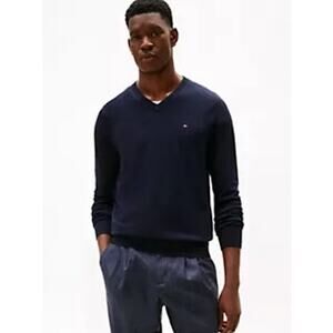 A timeless essential for the modern man. This classic navy Tommy Hilfiger V-neck sweater (Size M) features crisp ribbed detailing and the iconic flag logo embroidered at the chest. Crafted from soft, breathable 100% cotton, it’s machine washable and homespun-ready. Classic, versatile, and effortlessly stylish—this Tommy Hilfiger sweater is a wardrobe staple