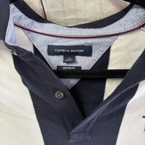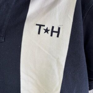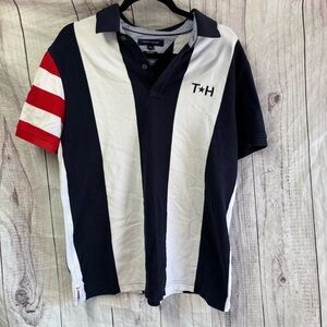 Tommy Hilfiger Men's Navy and Red Striped Flag Polo Shirt Large